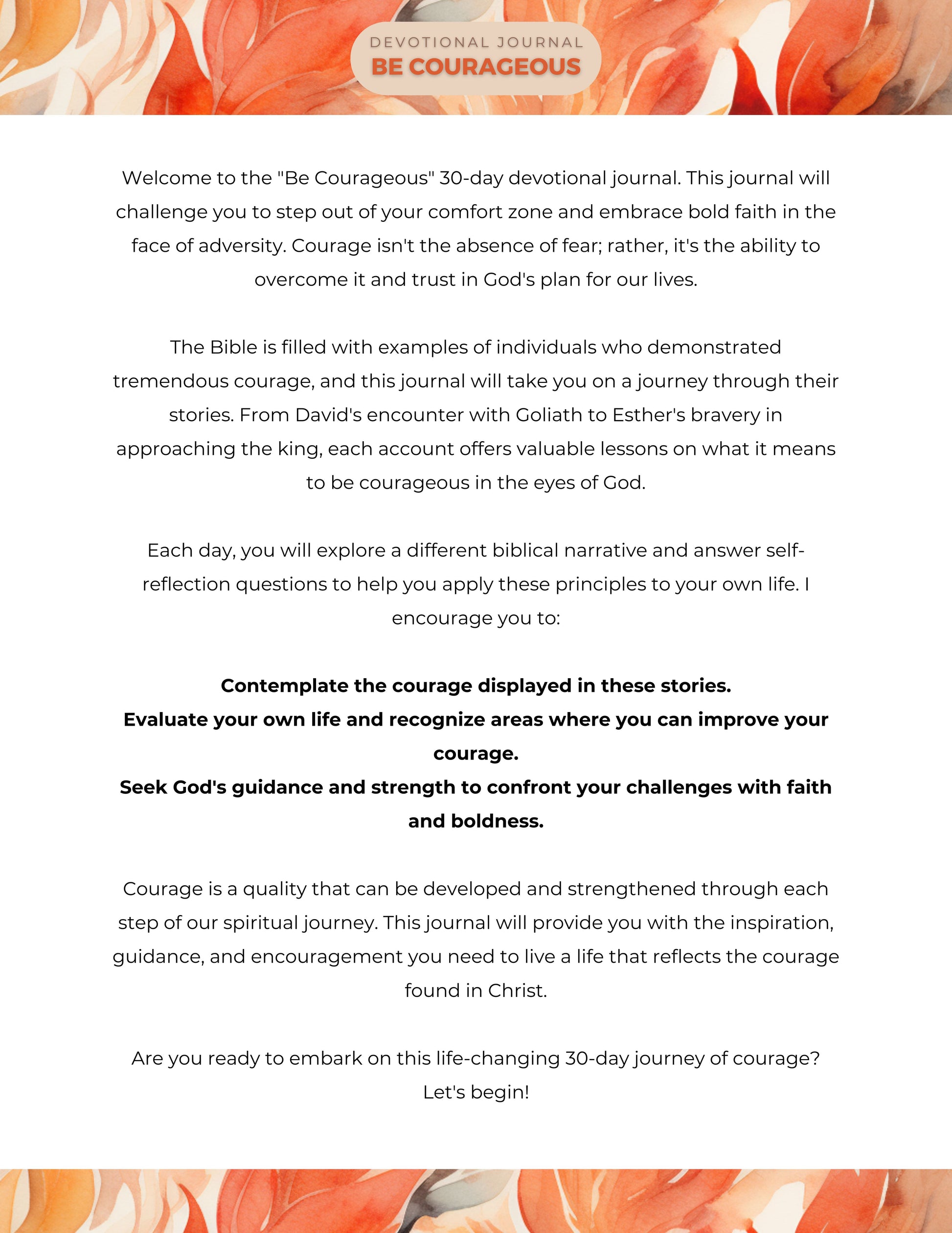 This 30 day journal will challenge you to step out of your comfort zone and embrace bold faith in the face of adversity. Courage isn't the absence of fear; rather, it's the ability to overcome it and trust in God's plan for our lives. Each day, you will explore a different biblical narrative and answer self-reflection questions to help you apply these principles to your own life. Courage is a quality that can be developed and strengthened through each step of our spiritual journey. This journal will provide you with the inspiration, guidance, and encouragement you need to live a life that reflects the courage found in Christ. Are you ready to embark on this life-changing 30-day journey of courage?